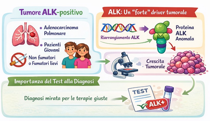 Uno di questi sottotipi è il tumore del polmone ALK-positivo, una forma relativamente rara ma estremamente importante perché dispone di terapie mirate altamente efficaci. Comprendere che cosa significhi “ALK-positivo”, quali pazienti colpisca più spesso, perché ALK è considerato un “driver forte” e perché sia fondamentale eseguire il test molecolare già alla diagnosi permette ai pazienti e ai familiari di affrontare il percorso di cura in modo più consapevole.